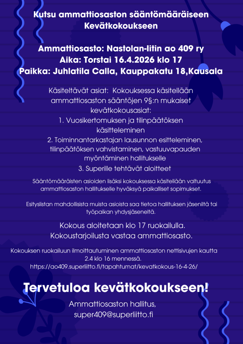 Nastolan-Iitin ao 409 ry sääntömääräinen kevätkokous järjestetään Kausalassa juhlatila Callassa klo 17 alkaen. Aloitetaan ruokailulla jonka jälkeen pidetään kokous alkaen n. klo18.00.